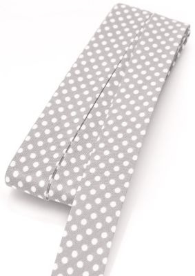 buttinette Baumwoll-Schrägband "Punkte", Farbe: hellgrau-weiss, Breite: 2 cm, von 4 cm auf 2 cm vorgefalzt, Länge: 5 m. Material: 100 % Baumwolle.