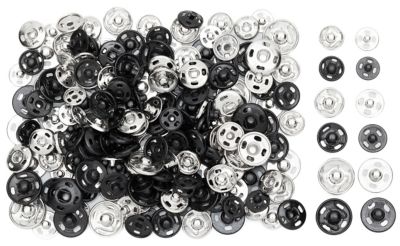 buttinette Zink-Messing-Druckknöpfe zum Annähen, Farbe: schwarz und silber, Grösse: 6–11 mm Ø, Inhalt: 100 Verschlüsse, sortiert. Material: Messing und Zink.