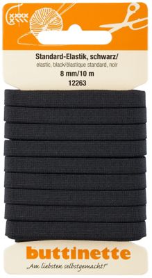 buttinette Gummiband "Standard-Elastik", Farbe: schwarz, Breite: 8 mm, Länge: 10 m. Material: 68 % Polyester, 32 % Elastodie.