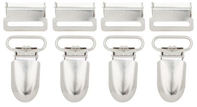 buttinette Hosenträger-Clips mit Versteller, Farbe: silber, Grösse: Clips 38 x 23 mm, Versteller 25 x 15 mm, für Bänder mit 20 mm Breite, Inhalt: 4 Clips und 4 Versteller. Material: Stahl.