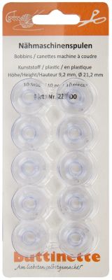 buttinette Nähmaschinenspulen für Horizontalgreifer, geeignet für Nähmaschinen ohne Spulenkapsel. Aus Kunststoff, transparent, in zwei Ausführungen lieferbar. Grösse: 21,2 mm Ø, Höhe: 9,2 mm.