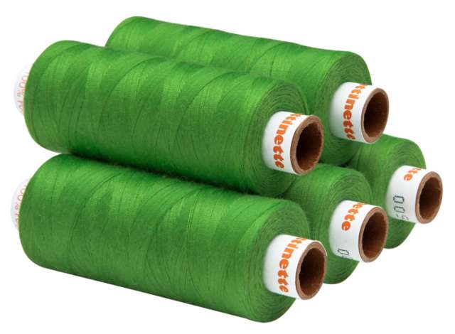 buttinette Universal-Nähgarn, Farbe: apfelgrün, Fadenstärke: 100, Nadelstärke: 60 - 100, Inhalt: 5 Spulen, 500 m pro Spule. Material: 100 % Polyester.