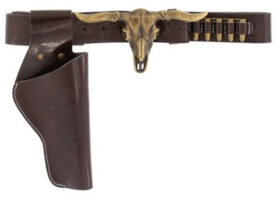 - Besonderheiten: geprägter Gürtel mit Rankenmuster, verschiebbares Holster mit Sheriff-Stern-Prägung, auffällige Büffel-Schnalle, coole Patronen-Attrappen