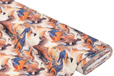 Elastik-Jersey "Aquarell" für Sportswear, Farbe: orange/blau, bi-elastisch, Breite: 150 cm, Gewicht: ca. 240 g/m². Material: 85 % Polyester, 15 % Elasthan.