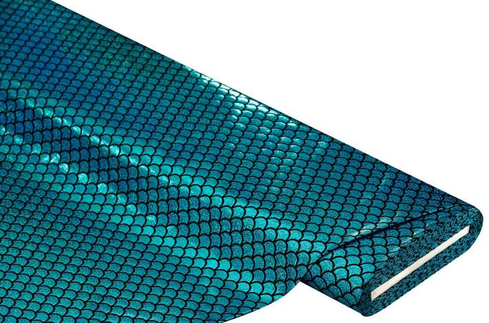 Folienjersey "Kleine Schuppen", Farbe: türkis, Rückseite: uni schwarz, querelastisch, Schuppen quer verlaufend, Schuppengrösse: 2 x 2 cm, Breite: 150 cm, Gewicht: ca. 150 g/m². Material: 100 % Polyester.