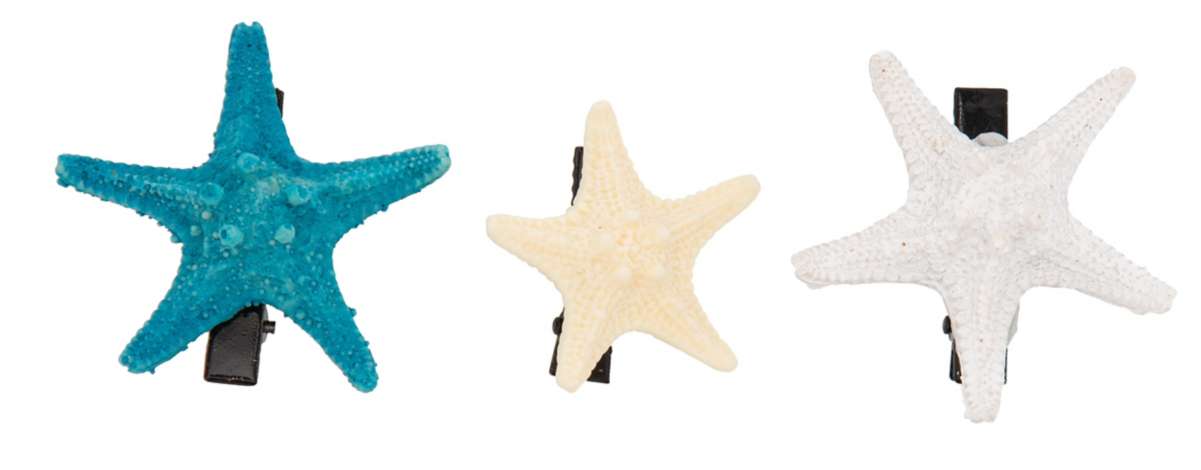 Seesterne im Haar? Warum eigentlich nicht! Zum Unterwasser-Kostüm kombiniert, machen die Seestern-Haarklammern richtig was her! Im Set sind jeweils drei Haarklammern in zwei verschiedenen Grössen enthalten. Entscheiden Sie selbst, ob Sie am liebsten alle tragen möchten oder ob Sie nur mit einer einzelnen Seestern-Haarklammer Akzente setzen möchten.