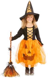 Wenn so eine süsse Kürbishexe vor Ihrer Halloweentür steht und nach Süssem oder Saurem fragt, können Sie doch gar nicht Nein sagen, oder? Das Hexenkleid mit dem weiten Tüllrock ist ein echter Hingucker und der schwarze Kürbisaufdruck sorgt für das gewisse Etwas. Zusammen mit dem Hexenhut in Schwarz und Orange ist der Kürbis-Hexen-Look für Halloween, Fasching oder die Motto-Geburtstagsparty komplett! Hokuspokus Hexenspass!