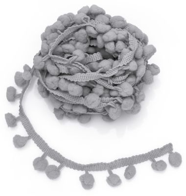 Pompon-Borte, Farbe: grau, Gesamtbreite: 20 mm, Pompon: 10 mm Ø, 5 m pro Rolle. Material: 100 % Polyester.