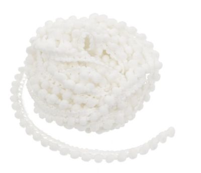 Pompon-Borte, Farbe: weiss, Gesamtbreite: 8 mm, Pompon: 5 mm Ø, 5 m pro Rolle. Material: 100 % Polyacryl.