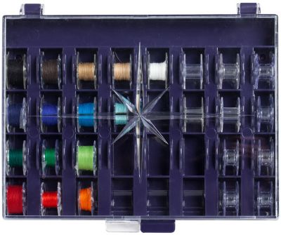 In der Prym Spulenbox bewahren Sie Ihre Unterfadenspulen übersichtlich und platzsparend auf. Bei Bedarf sind die Spulen ganz einfach aus den Mulden zu entnehmen. Die Spulenbox von Prym besteht aus robustem blauem Kunststoff mit transparentem Deckel. Setzen Sie mit der Spulenbox und den anderen praktischen Aufbewahrungslösungen von Prym dem Chaos im Nähzimmer ein Ende!